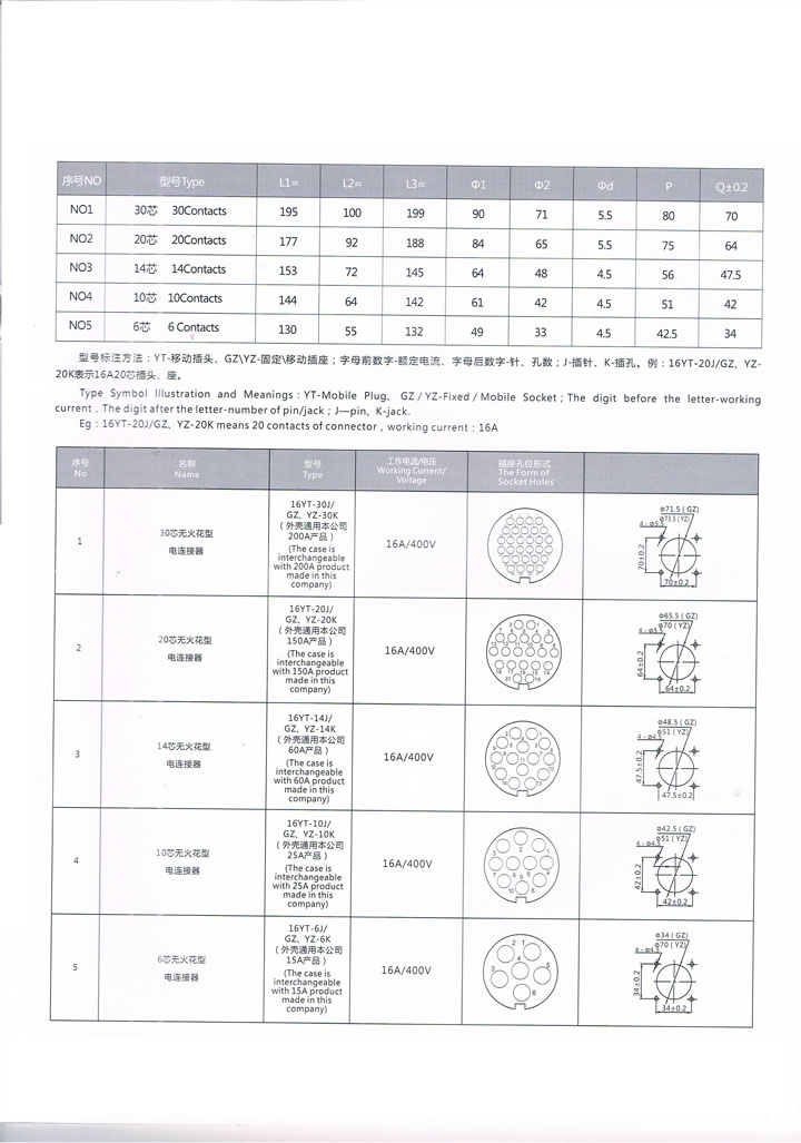 16YT/GZ、YZ多芯电连接器符合国标GB3836.8-2003《爆炸性气体环境用电设备第8部分:”n”型电气设备》的规定。防爆标志:ExnAII4,ExnAII6。主要用于石油勘探、钻井电控使用。