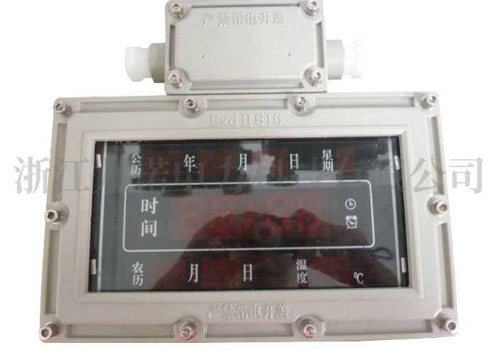 主要技术参数 1.防爆标志:ExibⅡCT6 (防爆电子钟),ExdibⅡCT6(防爆转接器) 2.电源电压 :AC220V±20%,50~60Hz 3.功率 :≤3.5W 4.计时精度:±1S/天 5.公历数据储存:50年 6.自动识别公历、农历、闰年、大小月、星期。 7.安装方式为壁挂式; 安装、使用、维护注意事项 1.防爆转接器接在防爆(数字)电子钟和交流电源之间。 2.连接:防爆转接器上标有“AC220V”的接线端子连接到交流220V电源上; 防爆转接器上标有“DC5V”的“+”接线端子连接到防爆数字电子钟内标有“+”的接线端子上; -接线端子连接到防爆(数字)电子钟内标有“-”的接线端子上。 3.防爆(数字)电子钟的调整方法见随机的使用说明书。 |